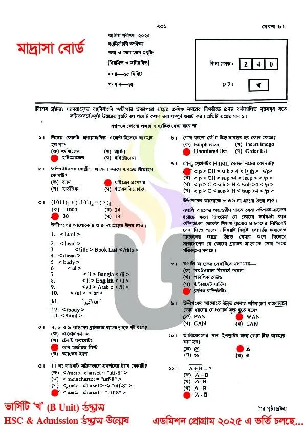 Alim Exam Means Secondary School Certificate Equivalent Exam in Madrasah Education Board, ICT Means Ucchotor Gonit Prothom Potro & MCQ Means multiple-choice question. In this post you will find ICT MCQ Question Solve 2025. ICT Subject Code is 230. In this exam students have to Answer 25 MCQ Type Questions within 25 Minutes. Students have to Carefully fill up the OMR sheet with Exam Year, Roll Number, Registration Number, Subject Code, Set Code & Correct Answer.