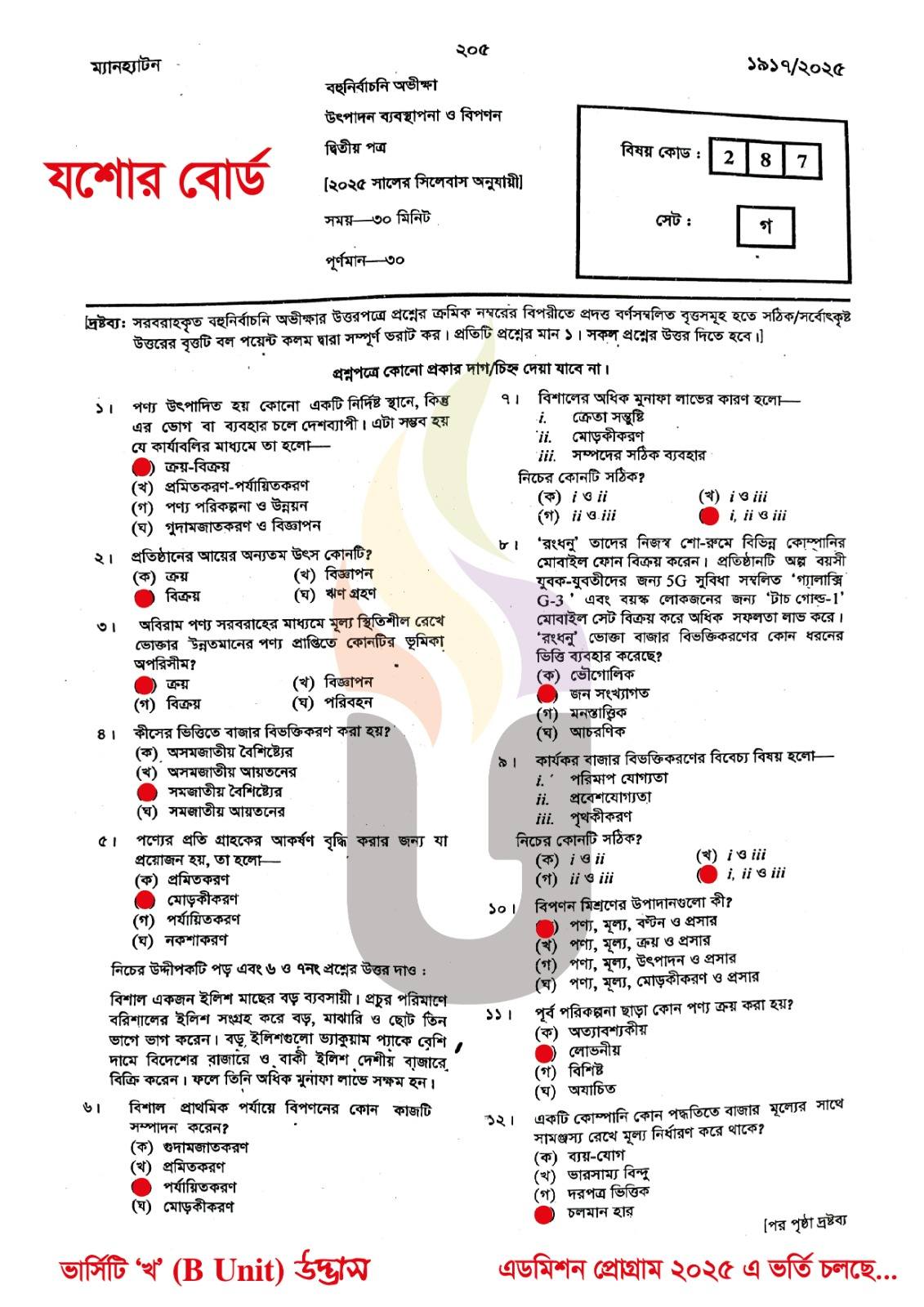 HSC Means Higher Secondary Certificate Exam, Production Management and Marketing 2nd Paper Means utpadon babosthapona o biponon ditiyo potro and MCQ means Multiple-Choice Question. In this post you will find HSC Production Management and Marketing 2nd Paper Question Solve 2025. Production Management and Marketing 2nd Paper Subject Code is 287. In this exam students have to Answer 30 Marks MCQ Questions within 30 Minutes. Students have to Carefully fill up the OMR sheet with Exam Year, Roll Number, Registration Number, Subject Code, Set Code & Correct Answer.