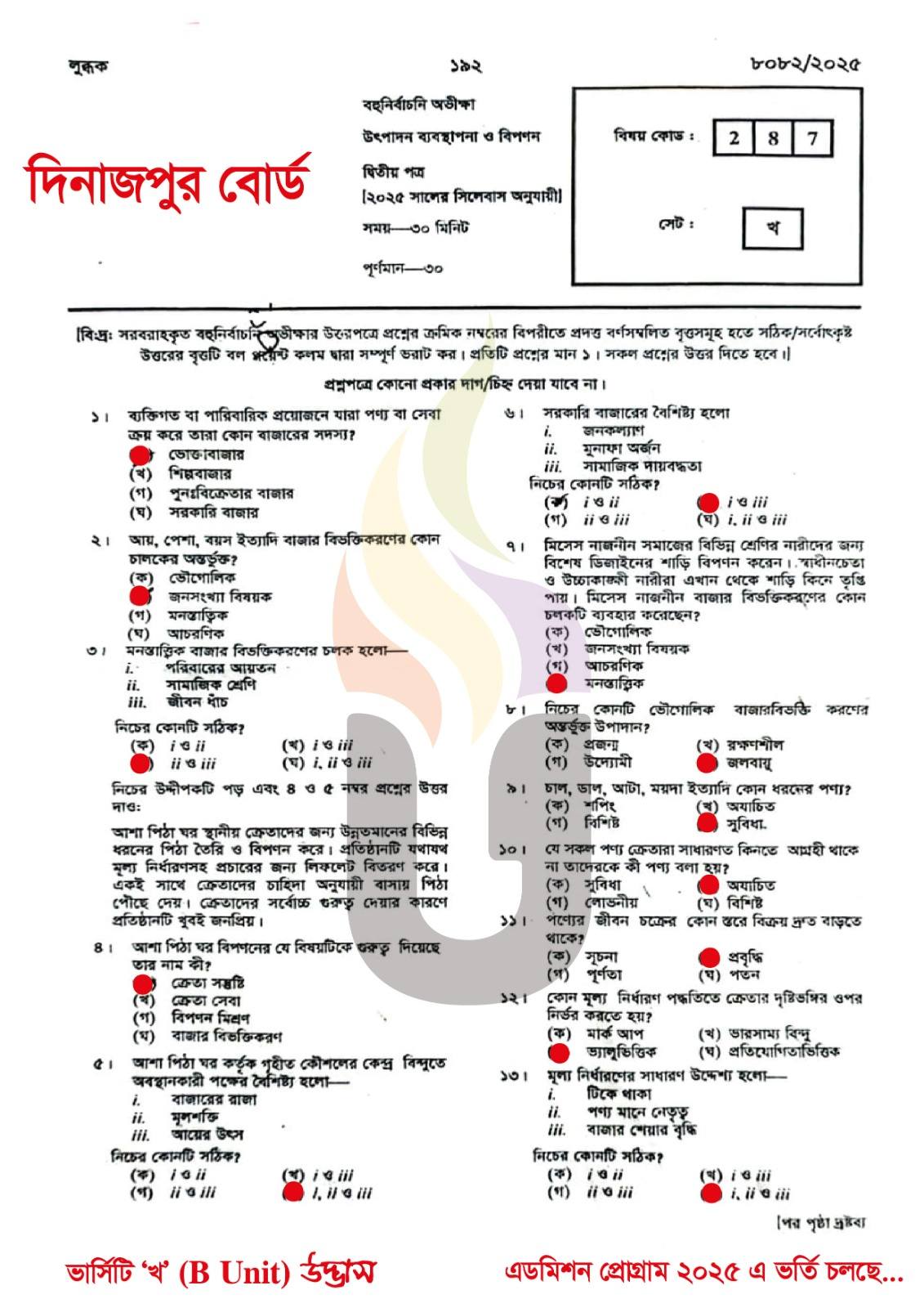 Production Management and Marketing 2nd Paper MCQ Question solution Dinajpur Board HSC 2025