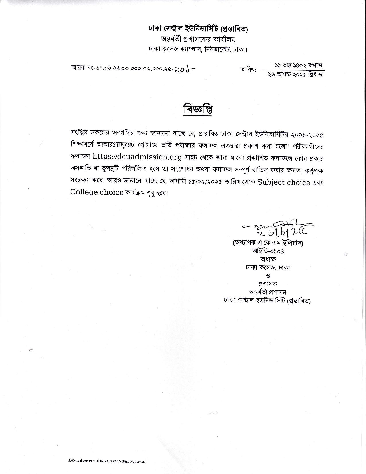 প্রস্তাবিত ঢাকা সেন্ট্রাল ইউনিভার্সিটি (DCU)-এর ২০২৪–২৫ শিক্ষাবর্ষের আন্ডারগ্র্যাজুয়েট ভর্তি পরীক্ষার ফলাফল প্রকাশিত হয়েছে। পরীক্ষার্থীরা অফিসিয়াল ওয়েবসাইট dcuadmission.org থেকে রোল ও সিরিয়াল নম্বর দিয়ে ফল দেখতে পারবেন। বিজ্ঞপ্তিতে বলা হয়েছে, প্রকাশিত ফলাফলে কোনো অসঙ্গতি শনাক্ত হলে তা সংশোধন বা বাতিল করার ক্ষমতা কর্তৃপক্ষ সংরক্ষণ করে।
