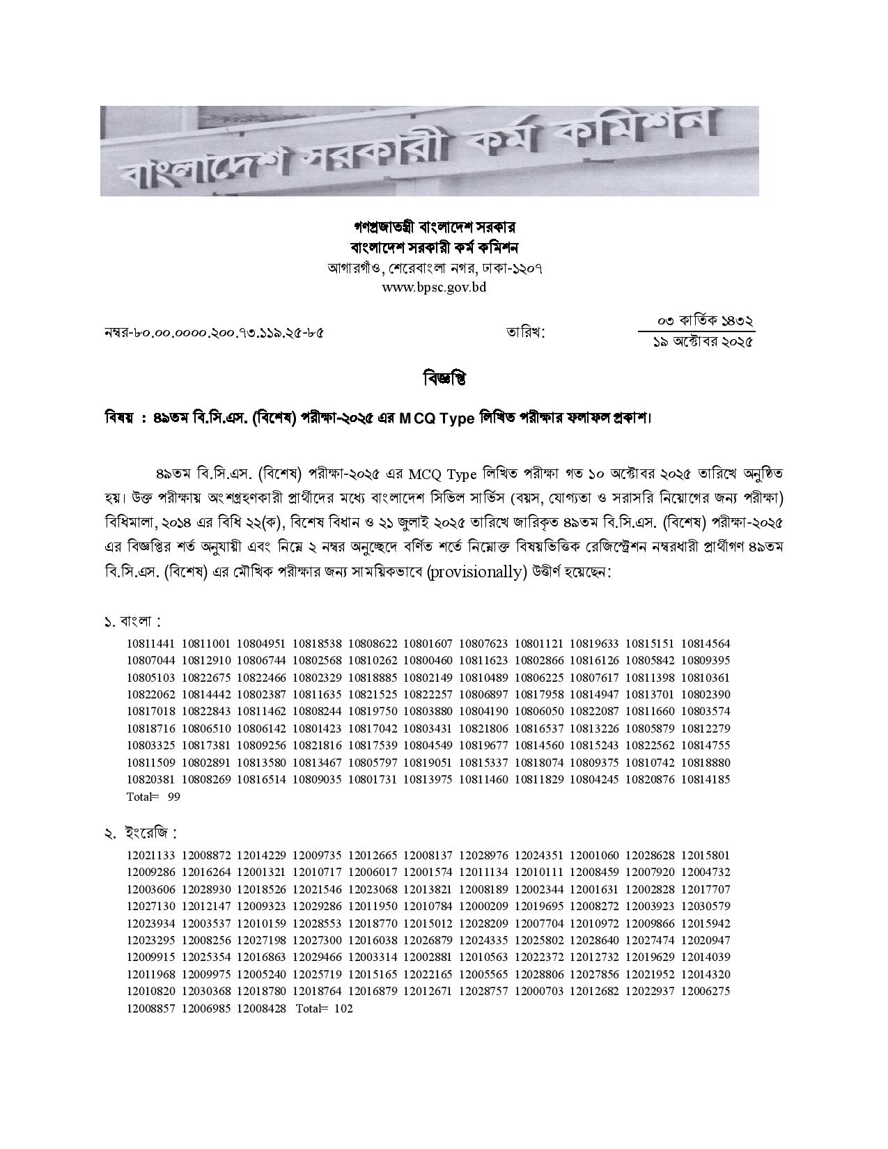 | ফল প্রকাশের তারিখ | ১৯ অক্টোবর ২০২৫ (রোববার রাত) |