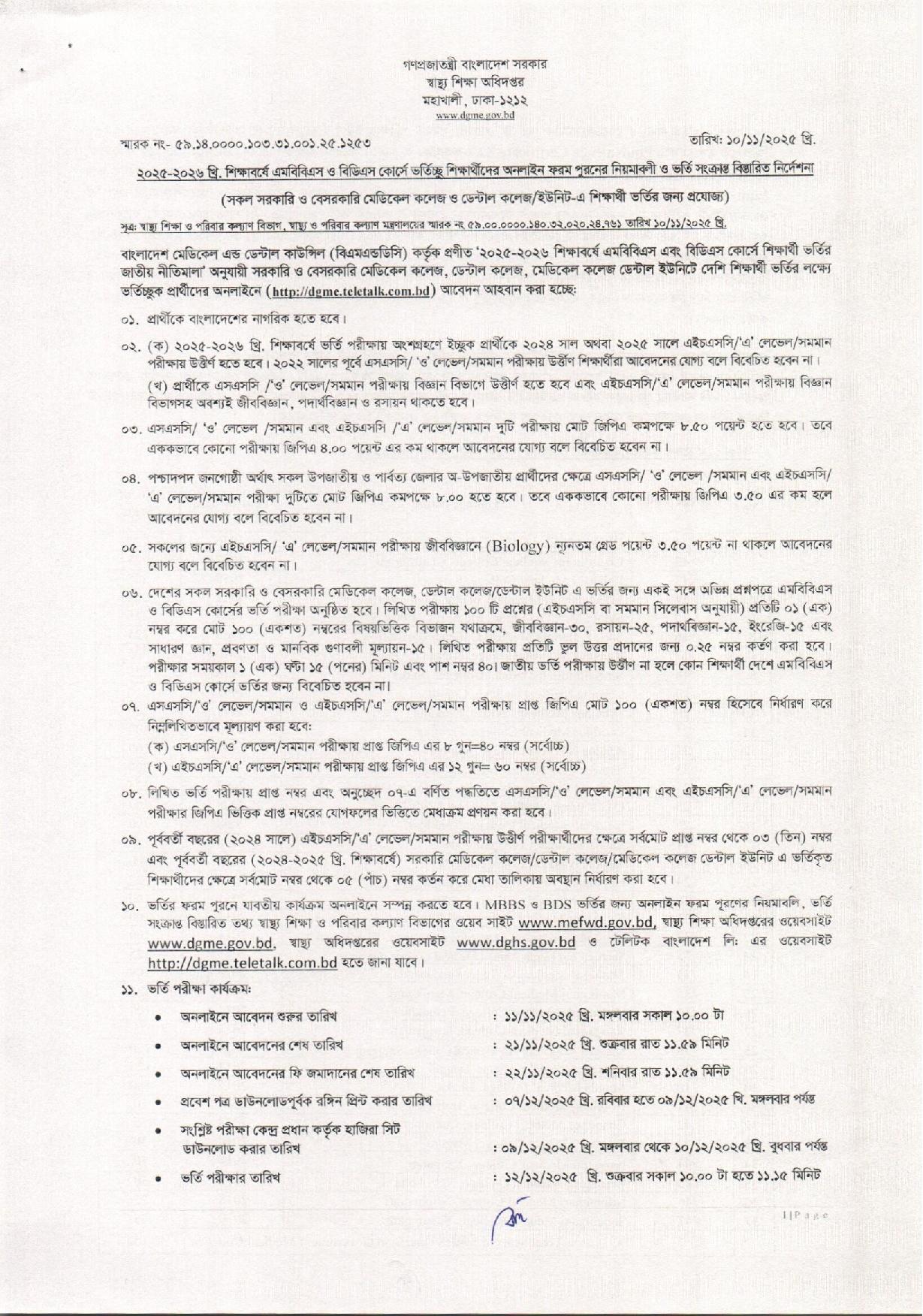 স্বাস্থ্য শিক্ষা অধিদপ্তর (DGME) কর্তৃক ২০২৫-২০২৬ শিক্ষাবর্ষে সরকারি ও বেসরকারি মেডিকেল এবং ডেন্টাল কলেজে এমবিবিএস ও বিডিএস কোর্সে ভর্তির বিজ্ঞপ্তি প্রকাশিত হয়েছে। যারা এমবিবিএস বা বিডিএস পড়ার স্বপ্ন দেখছেন, তাদের জন্য এটি একটি গুরুত্বপূর্ণ আপডেট।