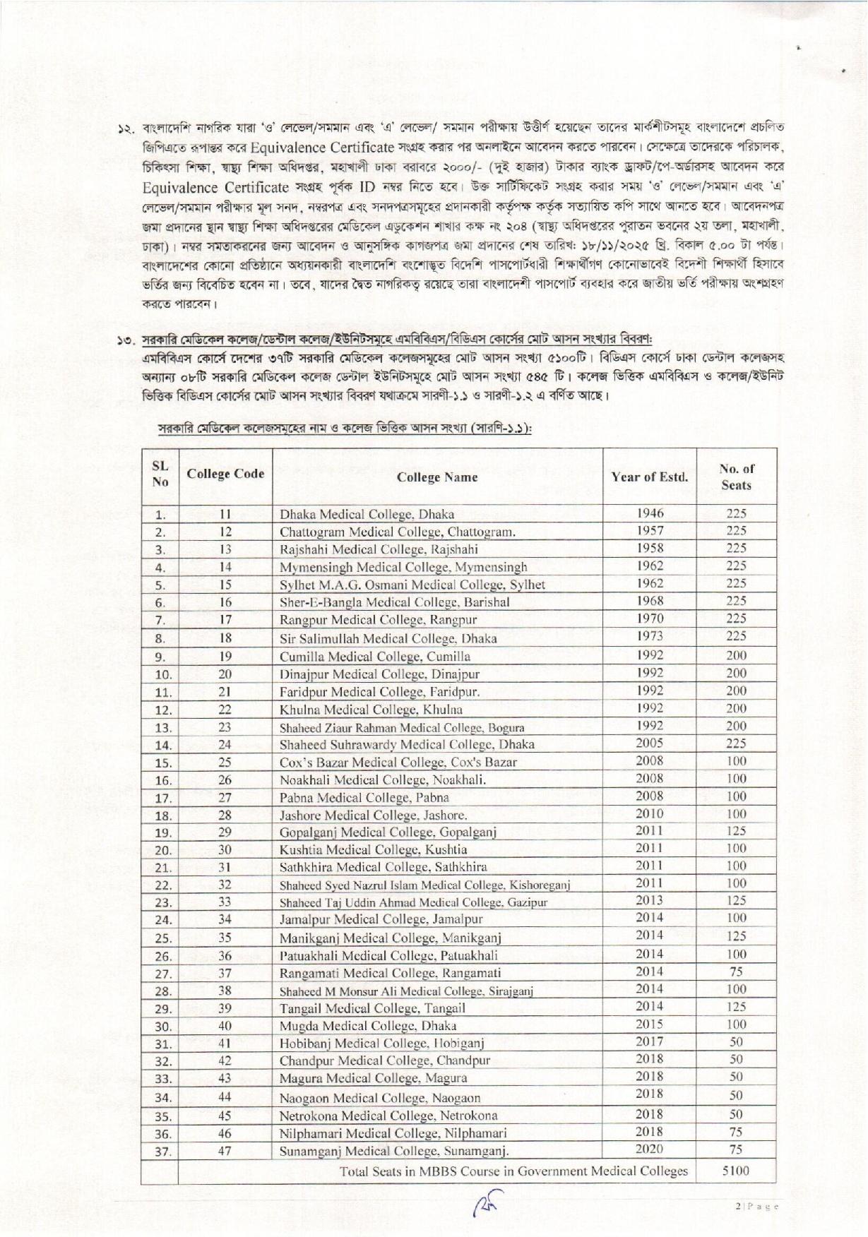 মেডিকেল কলেজ আসন সংখ্যা ২০২৫-২০২৬