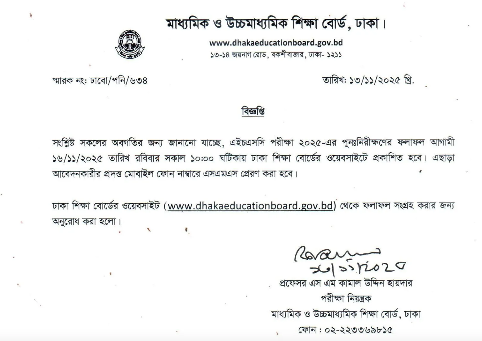 এইচএসসি পুনঃনিরীক্ষণের ফলাফল ২০২৫ ঢাকা বোর্ড pdf ডাউনলোড