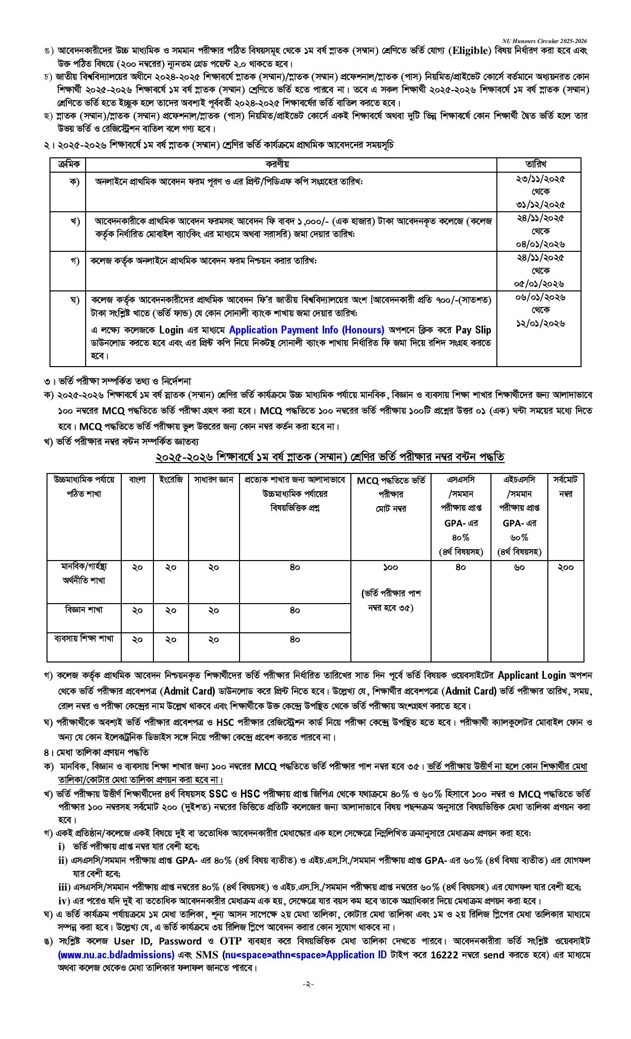 জাতীয় বিশ্ববিদ্যালয়ের ওয়েবসাইটে এই অনার্স ১ম বর্ষ ভর্তি বিজ্ঞপ্তি প্রকাশ করা হয়েছে। প্রকাশিত ভর্তি বিজ্ঞপ্তি অনুযায়ী আগামী ২৩ নভেম্বর ২০২৫ তারিখ থেকে অনলাইনে আবেদন প্রক্রিয়া শুরু হয়েছে। অনার্স ভর্তি সার্কুলার 2025 ও অনার্স ভর্তির গাইডলাইন ২০২৫ প্রকাশিত হয়েছে। জাতীয় বিশ্ববিদ্যালয়ের ওয়েবসাইটে ২০ ডিসেম্বর ২০২৫ তারিখে অনার্স প্রথম বর্ষ ভর্তির নোটিশ প্রকাশ করা হয়েছে। এবছর ভর্তি পরীক্ষা (এমসিকিউ) মাধ্যমে মেধাতালিকা নির্বাচিত হবে বলে বিজ্ঞপ্তিতে উল্লেখ্য করা হয়েছে।