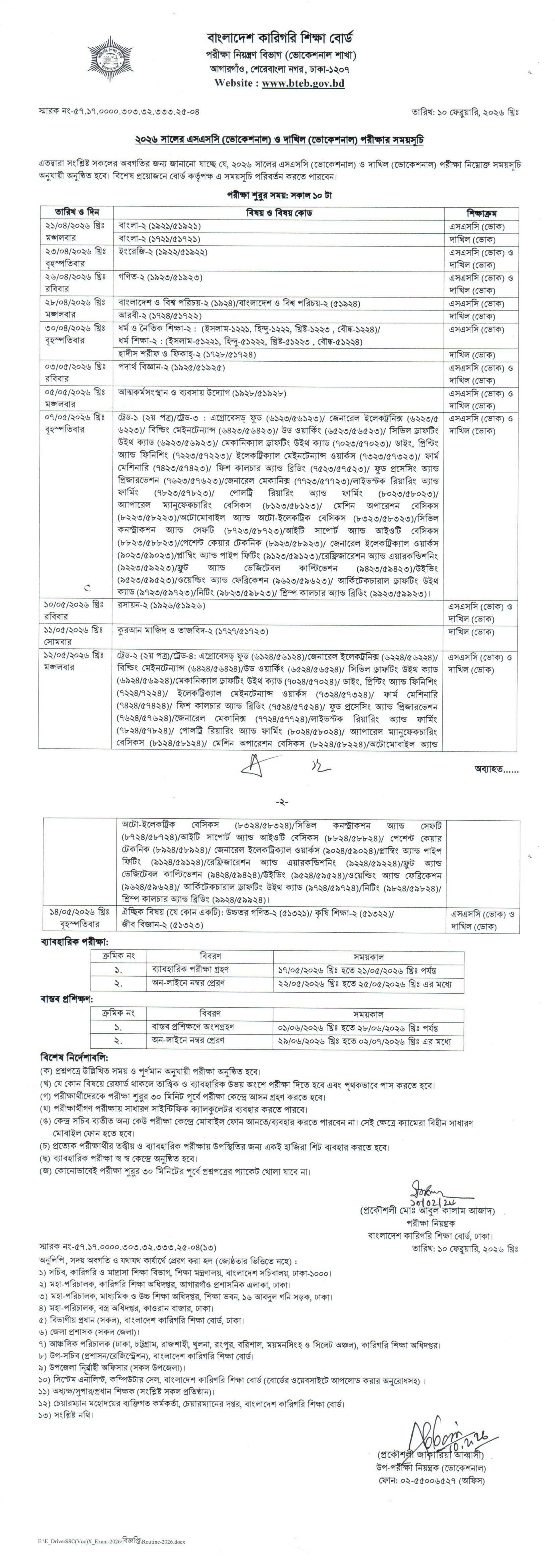 বাংলাদেশ কারিগরি শিক্ষা বোর্ড (BTEB) এই বছর ২০২৬ সালের এসএসসি ও দাখিল (ভোকেশনাল) পরীক্ষার চূড়ান্ত রুটিন প্রকাশ করেছে। ভোকেশনাল শিক্ষার্থীরা এপ্রিল থেকে জুন পর্যন্ত পরীক্ষায় অংশ নেবে। নিচে পরীক্ষার সমস্ত সময়সূচি, নির্দেশনা ও গুরুত্বপূর্ণ তথ্য তুলে ধরা হলো।