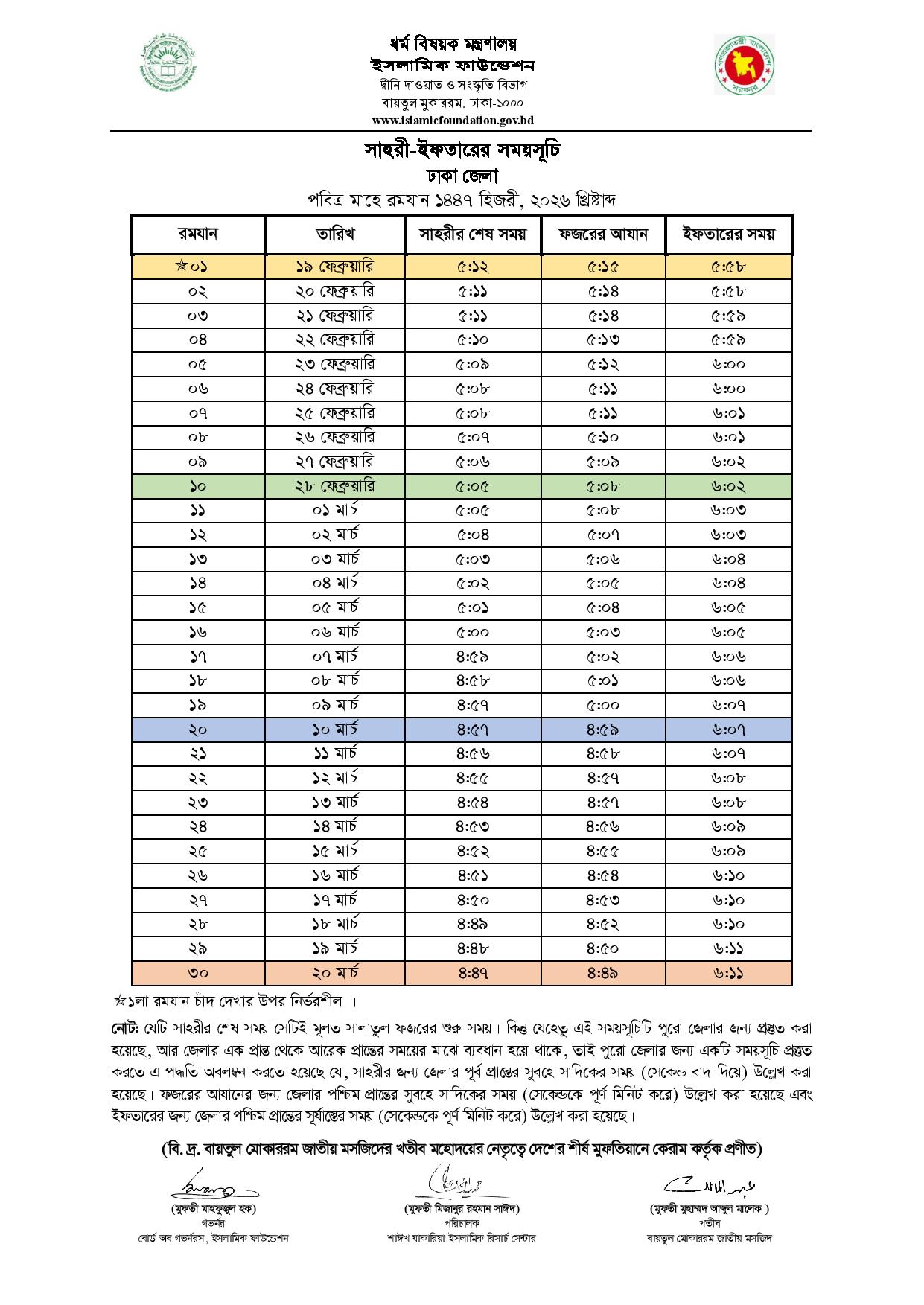 | ১০ | ২৮ ফেব্রুয়ারি | শনিবার | ৫-০৫ মিঃ | ৬-০২ মিঃ |