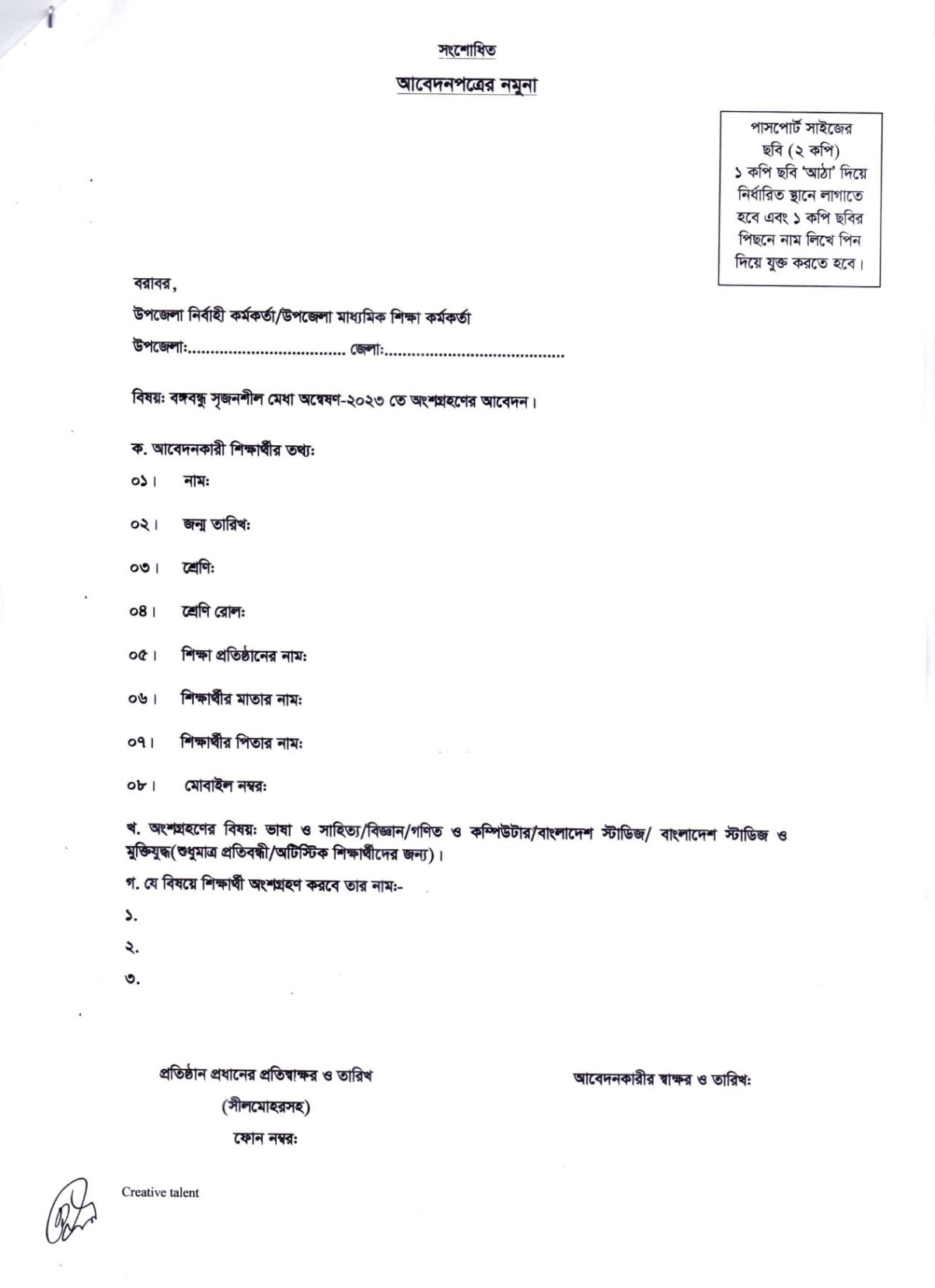 বঙ্গবন্ধু সৃজনশীল মেধা অন্বেষণ প্রতিযোগিতা আবেদনপত্রের নমুনা