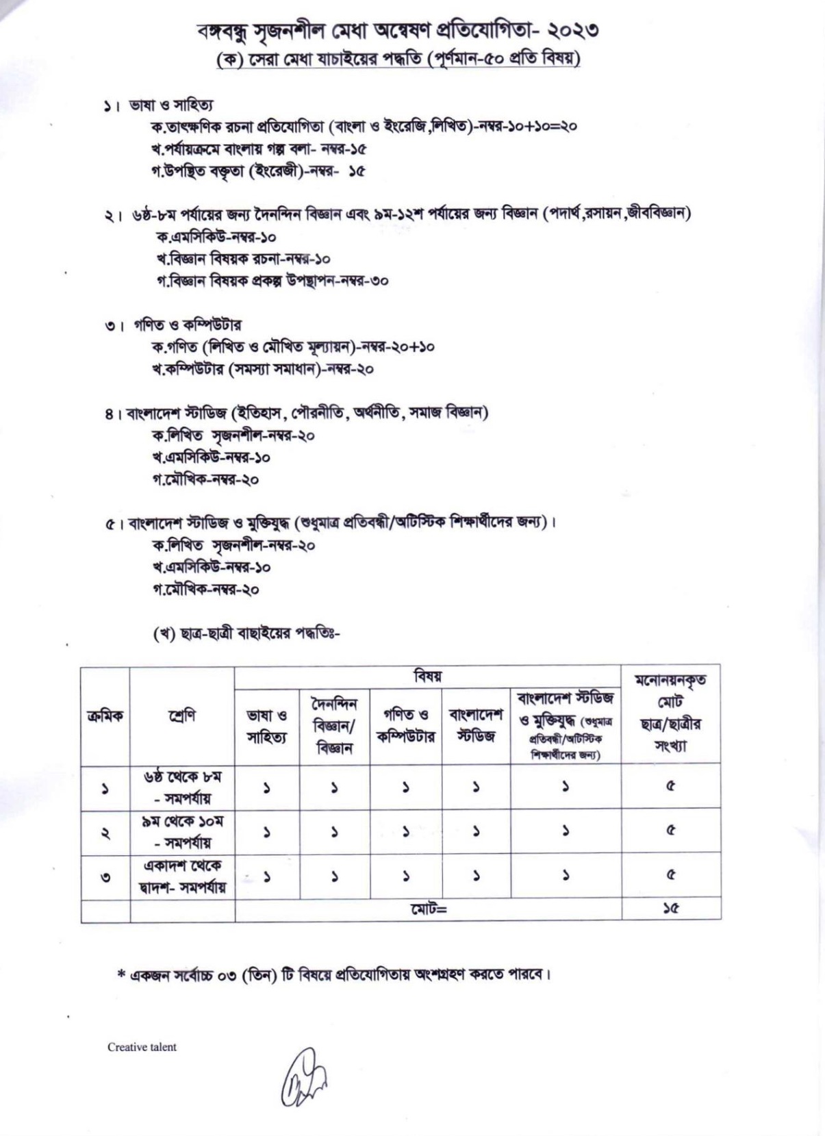 বঙ্গবন্ধু সৃজনশীল মেধা অন্বেষণ প্রতিযোগিতা ২০২৩ সিলেবাস