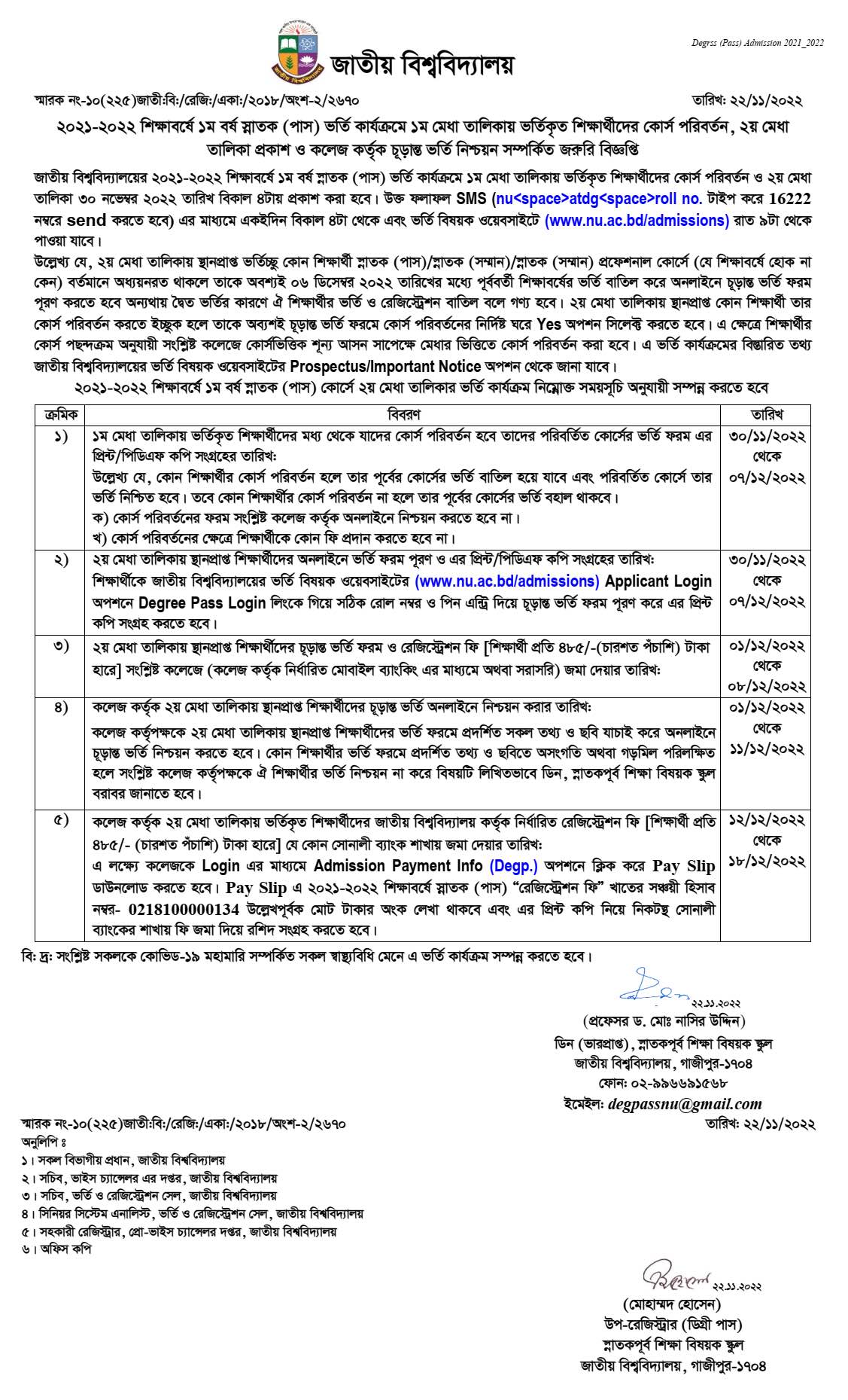 জাতীয় বিশ্ববিদ্যালয়ের ২০২১-২০২২ শিক্ষাবর্ষ ১ম বর্ষ স্নাতক (পাস) অর্থাৎ ডিগ্রি ভর্তি কার্যক্রমের ১ম মেধা তালিকায় ভর্তিকৃত শিক্ষার্থীদের কোর্স পরিবর্তন (মাইগ্রেসন) ও ২য় মেধা তালিকা ৩০ নভেম্বর ২০২২ তারিখ প্রকাশ করা হবে। উক্ত ফলাফল উল্লেখিত দিনে বিকাল ৪টার পর প্রথমে SMS এর মাধ্যমে তারপর রাত ৯ টার পর অনলাইনে প্রকাশ করা হবে। ডিগ্রি ভর্তির ২য় মেরিট লিস্ট রেজাল্ট ২০২২, ডিগ্রি ভর্তি মেধা তালিকার ফলাফল ২০২২ ও ডিগ্রি ভর্তি মাইগ্রেশনের রেজাল্ট ২০২২ জানতে এই পোস্টটি শেষ পর্যন্ত পড়ুন