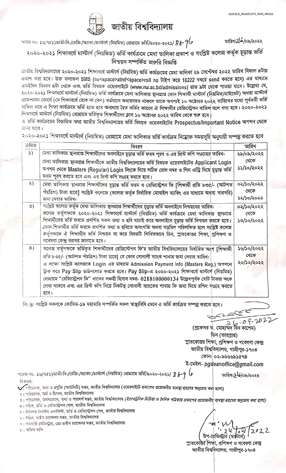 ১ম মেধাতালিকায় সুযোগপ্রাপ্তদের ২৯/০৯/২০২২ তারিখ থেকে ১১/১০/২০২২ তারিখ পর্যন্ত অনলাইনে চূড়ান্ত ভর্তি ফরম পূরণ ও এর প্রিন্ট কপি সংগ্রহ করতে হবে এবং ০২/১০/২০২২ তারিখ থেকে ১২/১০/২০২২ তারিখ পর্যন্ত সংশ্লিষ্ট কলেজ কর্তৃক নির্ধারিত মোবাইল ব্যাংকিং এর মাধ্যমে জমা দিতে হবে।