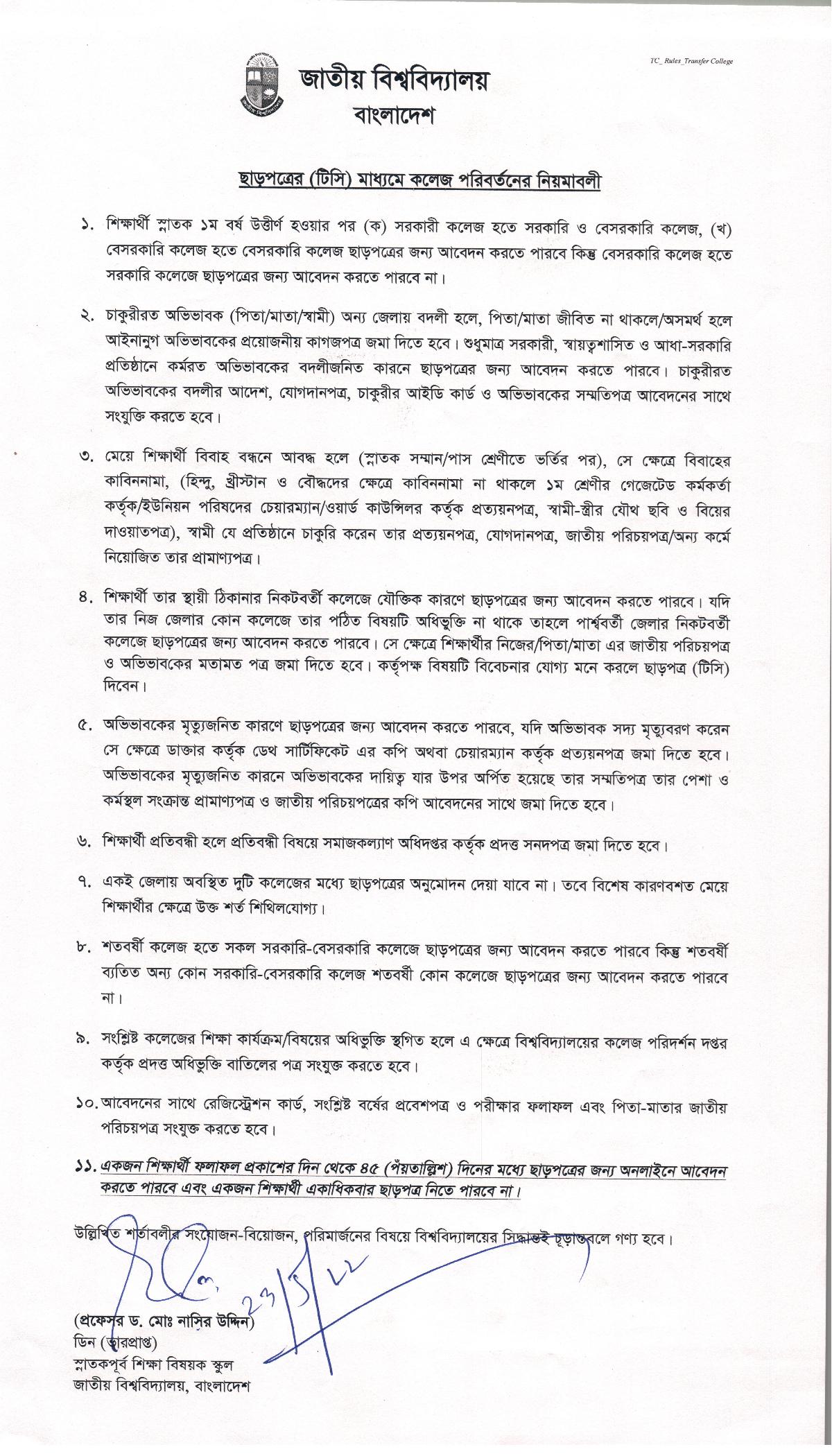 অনেক সময় জাতীয় বিশ্ববিদ্যালয়ের ছাত্র-ছাত্রীদের এক কলেজ থেকে অন্য কলেজ পরিবর্তনের প্রয়োজন হয়। জাতীয় বিশ্ববিদ্যালয়ের ওয়েবসাইটে প্রকাশিত এক বিজ্ঞপ্তিতে ছাড়পত্র/কলেজ পরিবর্তনের নিয়ম প্রকাশ করেছে বিশ্ববিদ্যালয় কর্তৃপক্ষ। চলুন জেনে নেওয়া যাক নিয়মাবলিঃ